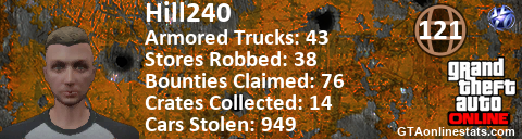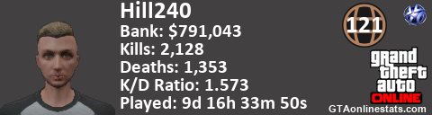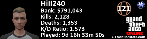 <a href="http://GTAonlinestats.com/showplayer/Hill240"><img src="http://GTAonlinestats.com/randomsignature/Hill240/sig.png" alt="Hill240" border="0" /></a>