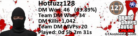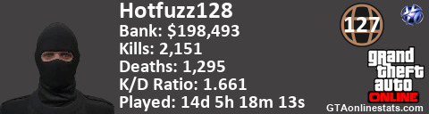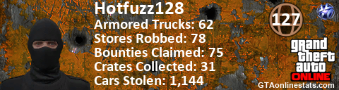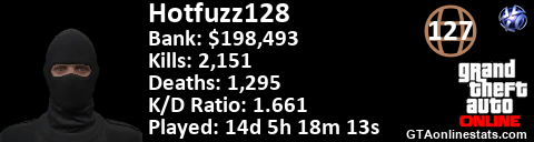 <a href="http://GTAonlinestats.com/showplayer/Hotfuzz128"><img src="http://GTAonlinestats.com/dmsignature/Hotfuzz128/sig.png" alt="Hotfuzz128" border="0" /></a>