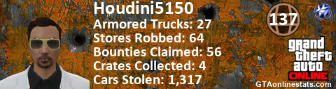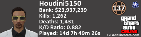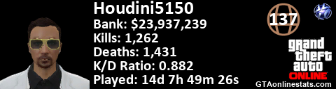 <a href="http://GTAonlinestats.com/showplayer/Houdini5150"><img src="http://GTAonlinestats.com/signature/Houdini5150/sig.png" alt="Houdini5150" border="0" /></a>
