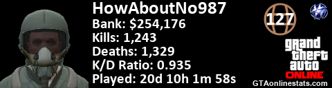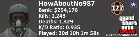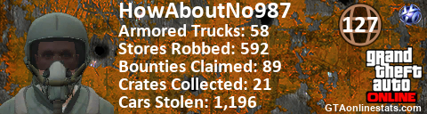 <a href="http://GTAonlinestats.com/showplayer/HowAboutNo987"><img src="http://GTAonlinestats.com/dmsignature/HowAboutNo987/sig.png" alt="HowAboutNo987" border="0" /></a>