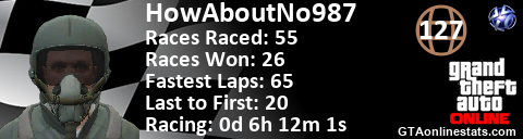 <a href="http://GTAonlinestats.com/showplayer/HowAboutNo987"><img src="http://GTAonlinestats.com/racesignature/HowAboutNo987/sig.png" alt="HowAboutNo987" border="0" /></a>