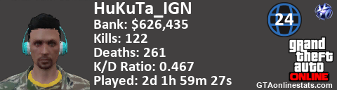 [URL=http://GTAonlinestats.com/showplayer/HuKuTa_IGN][IMG]http://GTAonlinestats.com/signature/HuKuTa_IGN/sig.png[/IMG][/URL]