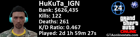 <a href="http://GTAonlinestats.com/showplayer/HuKuTa_IGN"><img src="http://GTAonlinestats.com/dmsignature/HuKuTa_IGN/sig.png" alt="HuKuTa_IGN" border="0" /></a>