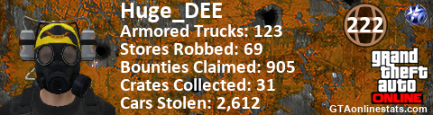 [URL=http://GTAonlinestats.com/showplayer/Huge_DEE][IMG]http://GTAonlinestats.com/crimesignature/Huge_DEE/sig.png[/IMG][/URL]