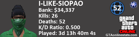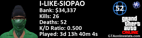 <a href="http://GTAonlinestats.com/showplayer/I-LIKE-SIOPAO"><img src="http://GTAonlinestats.com/signature/I-LIKE-SIOPAO/sig.png" alt="I-LIKE-SIOPAO" border="0" /></a>