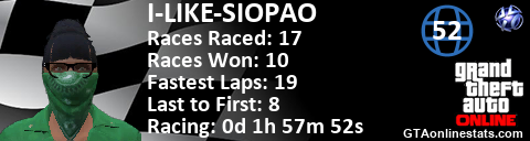 <a href="http://GTAonlinestats.com/showplayer/I-LIKE-SIOPAO"><img src="http://GTAonlinestats.com/racesignature/I-LIKE-SIOPAO/sig.png" alt="I-LIKE-SIOPAO" border="0" /></a>