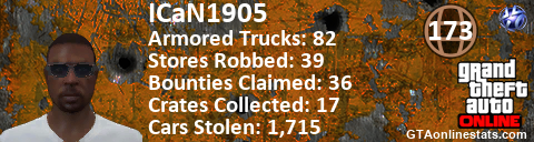 [URL=http://GTAonlinestats.com/showplayer/ICaN1905][IMG]http://GTAonlinestats.com/crimesignature/ICaN1905/sig.png[/IMG][/URL]