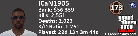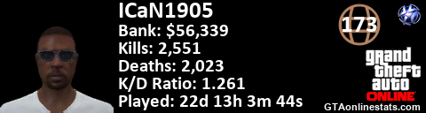 <a href="http://GTAonlinestats.com/showplayer/ICaN1905"><img src="http://GTAonlinestats.com/signature/ICaN1905/sig.png" alt="ICaN1905" border="0" /></a>