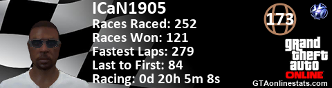 [URL=http://GTAonlinestats.com/showplayer/ICaN1905][IMG]http://GTAonlinestats.com/racesignature/ICaN1905/sig.png[/IMG][/URL]