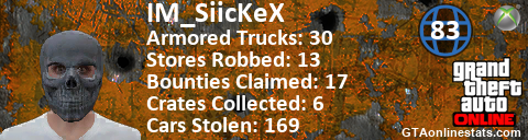 [URL=http://GTAonlinestats.com/showplayer/IM_SiicKeX][IMG]http://GTAonlinestats.com/crimesignature/IM_SiicKeX/sig.png[/IMG][/URL]