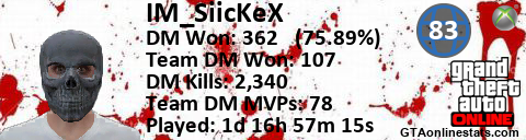 [URL=http://GTAonlinestats.com/showplayer/IM_SiicKeX][IMG]http://GTAonlinestats.com/dmsignature/IM_SiicKeX/sig.png[/IMG][/URL]