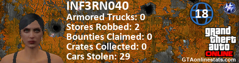 [URL=http://GTAonlinestats.com/showplayer/INF3RN040/2][IMG]http://GTAonlinestats.com/randomsignature/INF3RN040/2/sig.png[/IMG][/URL]