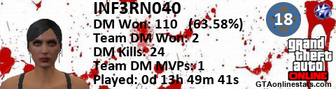 [URL=http://GTAonlinestats.com/showplayer/INF3RN040/2][IMG]http://GTAonlinestats.com/dmsignature/INF3RN040/2/sig.png[/IMG][/URL]