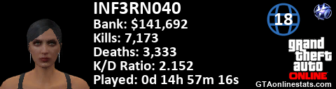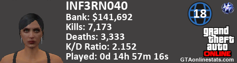 [URL=http://GTAonlinestats.com/showplayer/INF3RN040/2][IMG]http://GTAonlinestats.com/signature/INF3RN040/2/sig.png[/IMG][/URL]