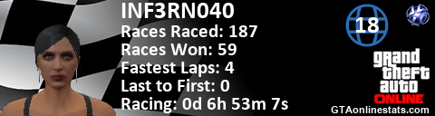 [URL=http://GTAonlinestats.com/showplayer/INF3RN040/2][IMG]http://GTAonlinestats.com/racesignature/INF3RN040/2/sig.png[/IMG][/URL]