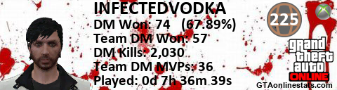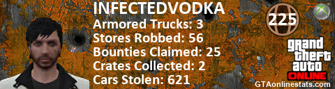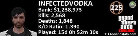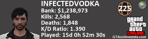 [URL=http://GTAonlinestats.com/showplayer/INFECTEDVODKA][IMG]http://GTAonlinestats.com/signature/INFECTEDVODKA/sig.png[/IMG][/URL]