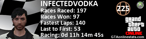 <a href="http://GTAonlinestats.com/showplayer/INFECTEDVODKA"><img src="http://GTAonlinestats.com/racesignature/INFECTEDVODKA/sig.png" alt="InfectedVodka" border="0" /></a>