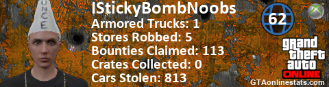 [URL=http://GTAonlinestats.com/showplayer/IStickyBombNoobs][IMG]http://GTAonlinestats.com/randomsignature/IStickyBombNoobs/sig.png[/IMG][/URL]