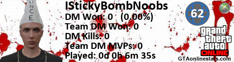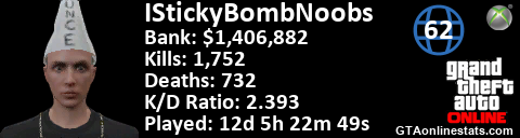 [URL=http://GTAonlinestats.com/showplayer/IStickyBombNoobs][IMG]http://GTAonlinestats.com/signature/IStickyBombNoobs/sig.png[/IMG][/URL]