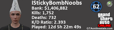 [URL=http://GTAonlinestats.com/showplayer/IStickyBombNoobs][IMG]http://GTAonlinestats.com/dmsignature/IStickyBombNoobs/sig.png[/IMG][/URL]