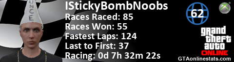 <a href="http://GTAonlinestats.com/showplayer/IStickyBombNoobs"><img src="http://GTAonlinestats.com/racesignature/IStickyBombNoobs/sig.png" alt="IStickyBombNoobs" border="0" /></a>