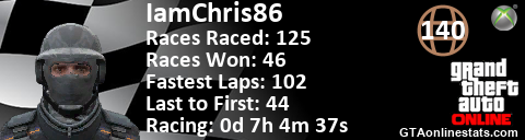 [URL=http://GTAonlinestats.com/showplayer/IamChris86][IMG]http://GTAonlinestats.com/racesignature/IamChris86/sig.png[/IMG][/URL]