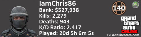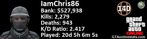 [URL=http://GTAonlinestats.com/showplayer/IamChris86][IMG]http://GTAonlinestats.com/signature/IamChris86/sig.png[/IMG][/URL]