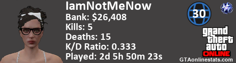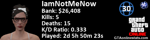 [URL=http://GTAonlinestats.com/showplayer/IamNotMeNow][IMG]http://GTAonlinestats.com/dmsignature/IamNotMeNow/sig.png[/IMG][/URL]