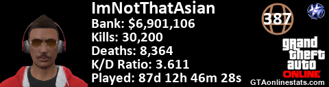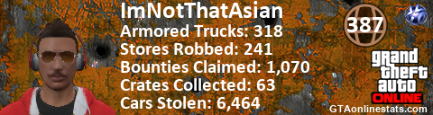 [URL=http://GTAonlinestats.com/showplayer/ImNotThatAsian][IMG]http://GTAonlinestats.com/randomsignature/ImNotThatAsian/sig.png[/IMG][/URL]