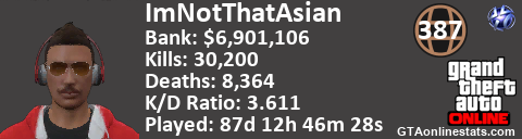 <a href="http://GTAonlinestats.com/showplayer/ImNotThatAsian"><img src="http://GTAonlinestats.com/signature/ImNotThatAsian/sig.png" alt="ImNotThatAsian" border="0" /></a>