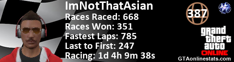 <a href="http://GTAonlinestats.com/showplayer/ImNotThatAsian"><img src="http://GTAonlinestats.com/racesignature/ImNotThatAsian/sig.png" alt="ImNotThatAsian" border="0" /></a>