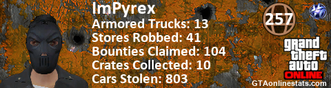 [URL=http://GTAonlinestats.com/showplayer/ImPyrex][IMG]http://GTAonlinestats.com/crimesignature/ImPyrex/sig.png[/IMG][/URL]