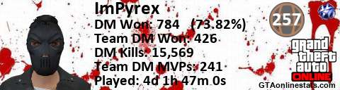 [URL=http://GTAonlinestats.com/showplayer/ImPyrex][IMG]http://GTAonlinestats.com/dmsignature/ImPyrex/sig.png[/IMG][/URL]