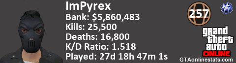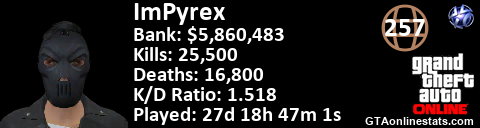 [URL=http://GTAonlinestats.com/showplayer/ImPyrex][IMG]http://GTAonlinestats.com/greysignature/ImPyrex/sig.png[/IMG][/URL]