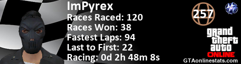 <a href="http://GTAonlinestats.com/showplayer/ImPyrex"><img src="http://GTAonlinestats.com/racesignature/ImPyrex/sig.png" alt="ImPyrex" border="0" /></a>