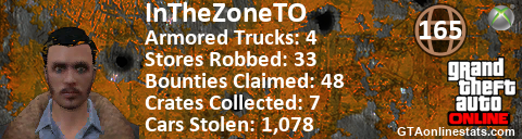 [URL=http://GTAonlinestats.com/showplayer/InTheZoneTO][IMG]http://GTAonlinestats.com/crimesignature/InTheZoneTO/sig.png[/IMG][/URL]