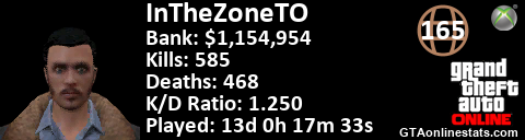 [URL=http://GTAonlinestats.com/showplayer/InTheZoneTO][IMG]http://GTAonlinestats.com/randomsignature/InTheZoneTO/sig.png[/IMG][/URL]