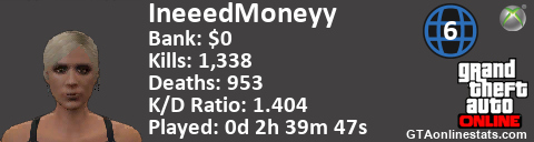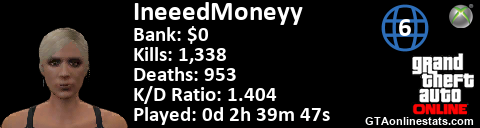[URL=http://GTAonlinestats.com/showplayer/IneeedMoneyy/2][IMG]http://GTAonlinestats.com/signature/IneeedMoneyy/2/sig.png[/IMG][/URL]