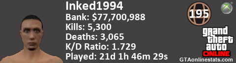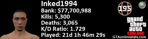 <a href="http://GTAonlinestats.com/showplayer/Inked1994"><img src="http://GTAonlinestats.com/randomsignature/Inked1994/sig.png" alt="Inked1994" border="0" /></a>