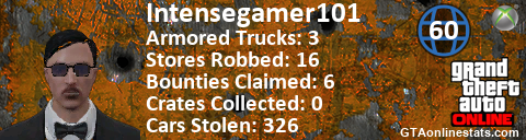[URL=http://GTAonlinestats.com/showplayer/Intensegamer101][IMG]http://GTAonlinestats.com/crimesignature/Intensegamer101/sig.png[/IMG][/URL]
