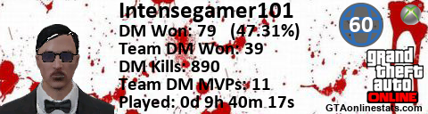 [URL=http://GTAonlinestats.com/showplayer/Intensegamer101][IMG]http://GTAonlinestats.com/dmsignature/Intensegamer101/sig.png[/IMG][/URL]