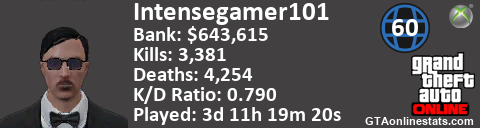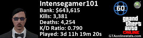 <a href="http://GTAonlinestats.com/showplayer/Intensegamer101"><img src="http://GTAonlinestats.com/signature/Intensegamer101/sig.png" alt="Intensegamer101" border="0" /></a>