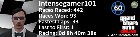 <a href="http://GTAonlinestats.com/showplayer/Intensegamer101"><img src="http://GTAonlinestats.com/racesignature/Intensegamer101/sig.png" alt="Intensegamer101" border="0" /></a>