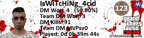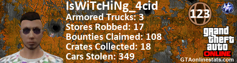 [URL=http://GTAonlinestats.com/showplayer/IsWiTcHiNg_4cid][IMG]http://GTAonlinestats.com/randomsignature/IsWiTcHiNg_4cid/sig.png[/IMG][/URL]