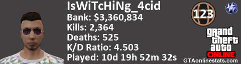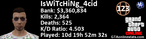 <a href="http://GTAonlinestats.com/showplayer/IsWiTcHiNg_4cid"><img src="http://GTAonlinestats.com/signature/IsWiTcHiNg_4cid/sig.png" alt="IsWiTcHiNg_4cid" border="0" /></a>