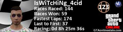[URL=http://GTAonlinestats.com/showplayer/IsWiTcHiNg_4cid][IMG]http://GTAonlinestats.com/racesignature/IsWiTcHiNg_4cid/sig.png[/IMG][/URL]