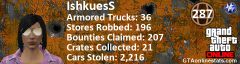 [URL=http://GTAonlinestats.com/showplayer/IshkuesS][IMG]http://GTAonlinestats.com/crimesignature/IshkuesS/sig.png[/IMG][/URL]