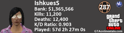 [URL=http://GTAonlinestats.com/showplayer/IshkuesS][IMG]http://GTAonlinestats.com/greysignature/IshkuesS/sig.png[/IMG][/URL]