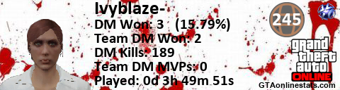 [URL=http://GTAonlinestats.com/showplayer/Ivyblaze-][IMG]http://GTAonlinestats.com/dmsignature/Ivyblaze-/sig.png[/IMG][/URL]