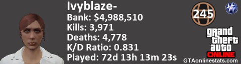 [URL=http://GTAonlinestats.com/showplayer/Ivyblaze-][IMG]http://GTAonlinestats.com/signature/Ivyblaze-/sig.png[/IMG][/URL]